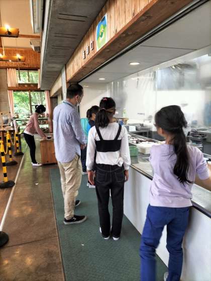 朝食タイムです。まずパンかご飯(最終的にはおかわり自由なので両方食べる人もいました)スープかおみそ汁を選びます。おかずはバイキングです。ミートボールやナゲット、サバ焼きやがんも煮などまたたくさんいただきました。受け取り方や片付け方などとても上下になりました。