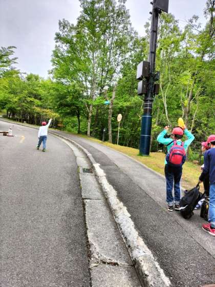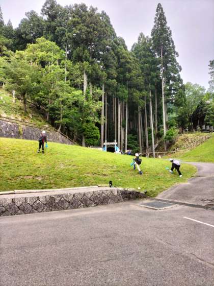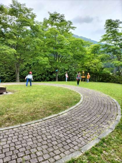 お天気がまだなんとか大丈夫そうなので、予定していたフライングディスクゴルフをしています。「おしい!」「よし、いい感じ!」と、グループでよいかけ声で励まし合いながら楽しくチャレンジしています。