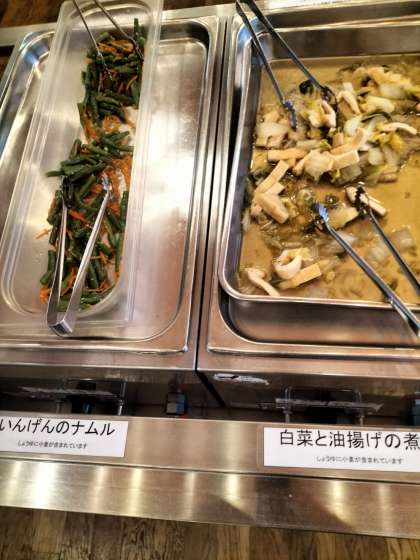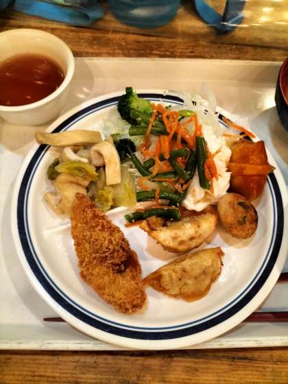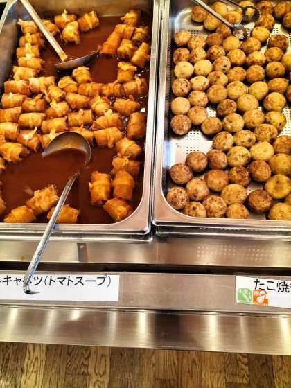 夕食タイムです。揚餃子やロールキャベツ、たこ焼きが人気でした。食堂での食事はこれが最後です。明日は野外活動で朝昼の献立を自分たちで作ります。