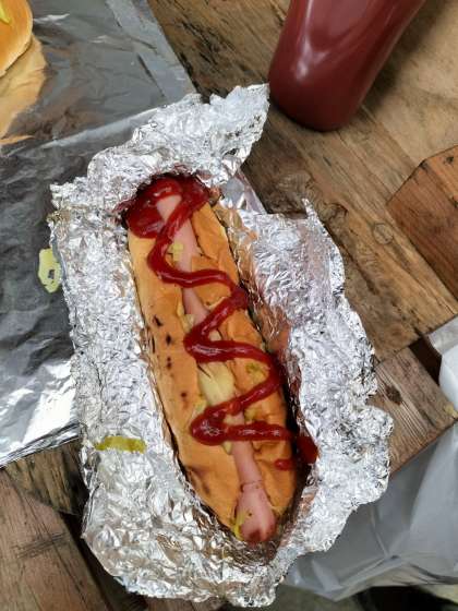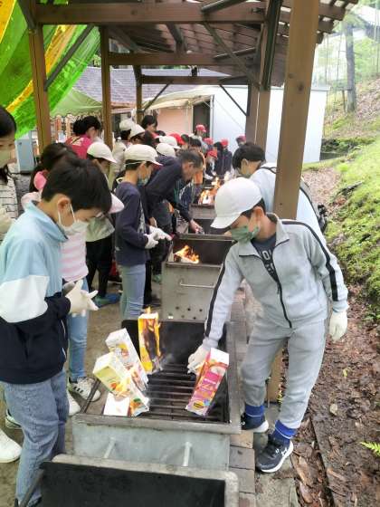 おはようございます。今日の朝食はパックドックです。パンの切れ目にカレー風味のキャベツとウインナーを挟み、アルミホイルに包んで紙パックに入れて燃やします。紙パックが燃えつきたら出来上がりです。
