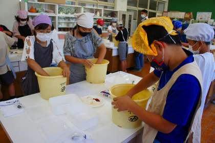 ぬかを炒って、香りの変化を実感させていただきました。また、ぬかは米からできているので、食べることができます。恐る恐る口にしてみると・・・「甘い!」「美味しい。」今日初めてぬかに触れた子も多かったようです。