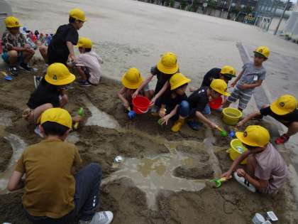 図工科で「すなやつちとなかよし」の学習をしました。水を少し入れてだんごを作ったり、カップでいろいろな形をつくって並べたりしていろいろためしながら形作りを楽しみました。道を作って水を流すとどうなるかやってみる子たちもいました。最後には道をどんどんつなげていって、大きな川ができました。みんなで協力すると1人ではできないこともできました。「見て!だんご三兄弟!」「たぷたぷしていて気持ちいいよ」「さわってみたい!」体全体を使って楽しく学習することができました。