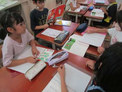 国語科「アップとルーズで伝えよう」では、筆者の考えに対する自分の考えをまとめ、そのことを友だちと交流しました。物事を伝えるときにはどのようなことに気をつければよいのか、考えを広げることができました。
