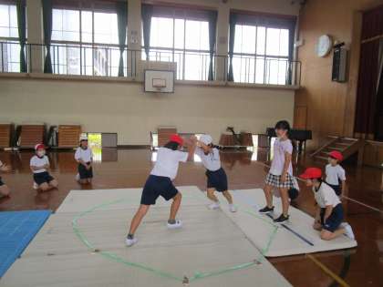 体育科では「すもうあそび」がスタート。おしずもうとけんけんずもうの2つに取り組んだ子どもたち。ルールや進め方を知ることができました。