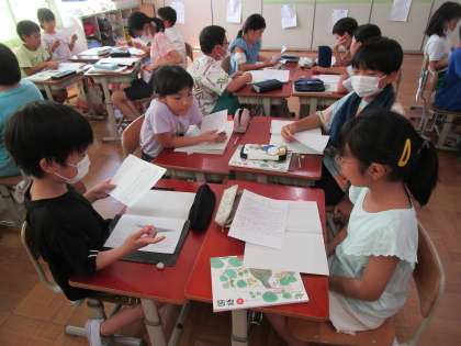 国語科「一つの花」では、書いた感想文をグループで交流しました。同じ考え方なのか、違う考え方なのか。自分と比べながら聞いていきました。