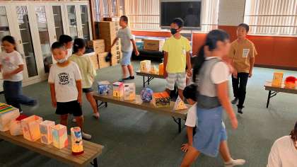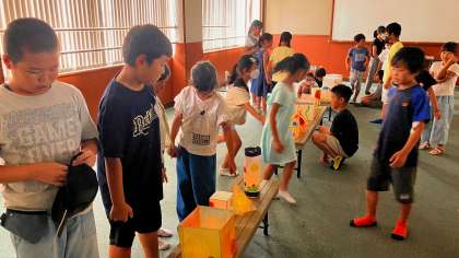 今回は、3年生に6年生の作品を見てもらう会を開きました。教室が隣の3年生。廊下の前に置いている「すてきな明かり」の作品を見て、「すごいな〜!」「きれいやな〜!」と言ってくれていたのが嬉しくて、「じゃあ、明かりが灯ったところも見てもらおう!」と、企画しました。