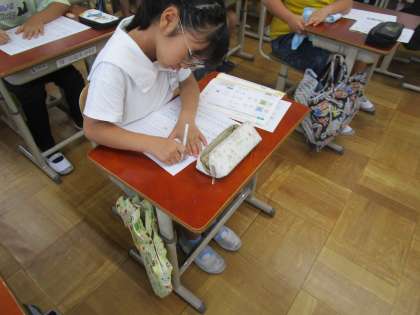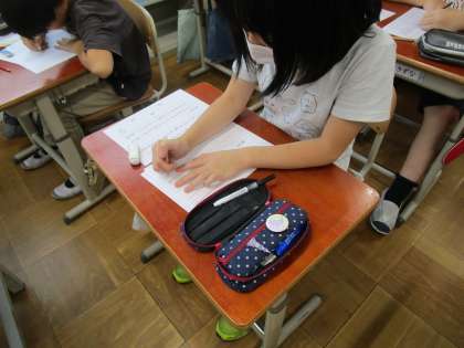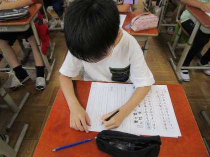 書写では「短歌」の学習をしました。中央に線を入れることで、文字の大きさや配列に気をつけて書いていくことができました。