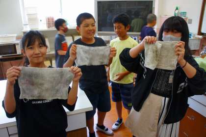 まっくろに汚れた水と、まっしろになった布を見比べて「すご〜い!頑張ったなぁ!」と満足そうな子どもたちでした。