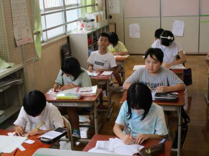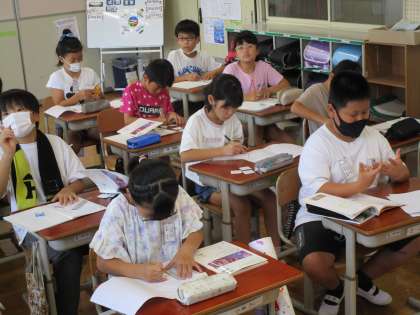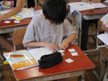 算数科「垂直・平行と四角形」では、カードに描かれた点をつないで、四角形を描いていきました。テレビの画面に写し出された図形の頂点の位置を確認しながら、定規で線を引いて描いていく子どもたち。夏休み明け初日でしたが、とても集中していました。