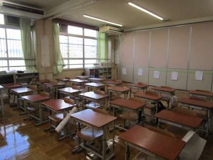 二学期始業式に向かう子どもたちの机。机上には何もなく、椅子もしっかり入っています。こうしたことに気を配れる子どもたち。さすがです。