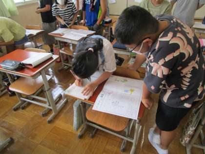 国語科「新聞を作ろう」では、作成した「さすてな京都」についての新聞を読み合いました。内容や書き方でいいところを見つけ、友だちのノートにコメントを書きこんでいきました。