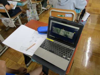 理科「季節と生き物(夏の終わり)」では、夏休み明けの植物の様子を観察しました。自分が決めた植物をタブレットで撮影して、教室に戻って気づいたことや絵を観察カードにかきまとめました。