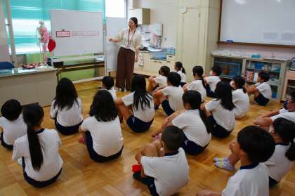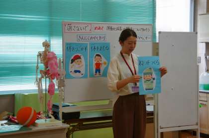 身長・体重をはかる前に、養護教諭の上田先生から「筋肉」についてのお話を聞きました。よい筋肉を育てていくためには、成長期である今この時期に身体を動かす必要があります。少し暑さも和らいできましたので、ぜひ少しずつ運動する習慣をつけ、健康な身体を作ってほしいです。