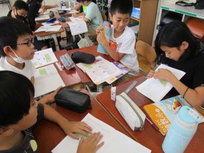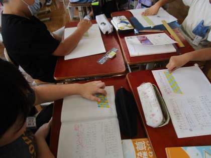 算数科「垂直・平行と四角形」では、平行四辺形をしきつめて模様を作りました。その模様の中からいろいろな形や大きさをした平行四辺形を見つけていきました。