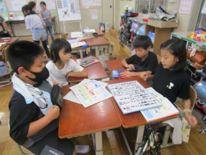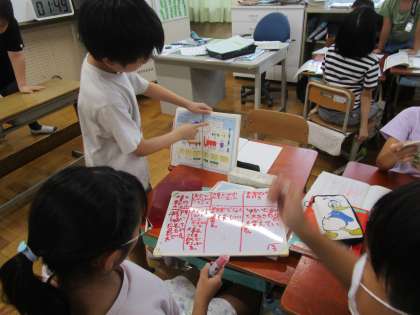国語科「パンフレットを読もう」では、パンフレットの工夫をグループで探していきました。グループで話し合うことで、たくさんの工夫を見つけることができました。
