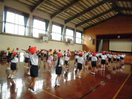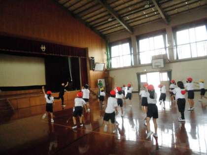 体育の授業です。動きを覚えて、音楽に合わせてダンスします。