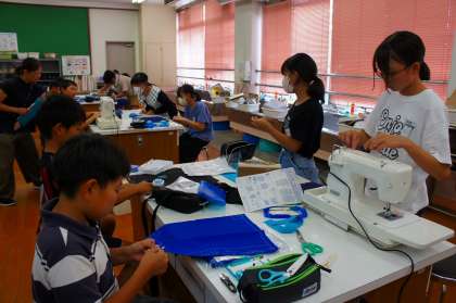 トートバックを作成中です!用途に合わせて、まちの大きさを工夫しています。玉止め、玉結び、ミシンの使い方・・・覚えていますか?安全に気をつけて、作っていきましょうね。