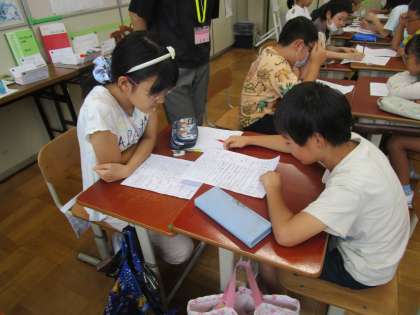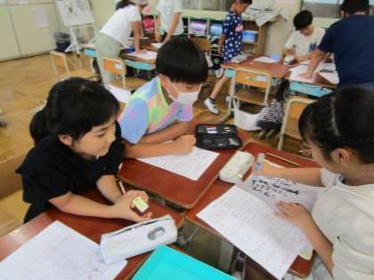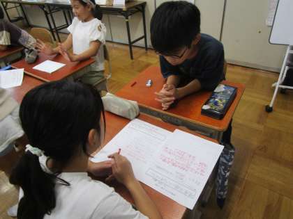 総合的な学習の時間では、調べた環境問題について、ペアで交流しました。その後、グループで聞いてきた問題を出し合いました。