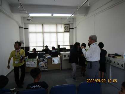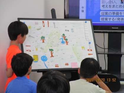 市役所のブースの様子です。市役所では、午前中、職員と市民に分かれ、住民票の発行手続きの仕方を体験しました。相手の目を見て丁寧な言葉で話していました。午後からは「みんなが楽しめる公園」を作る計画を話し合っていました。