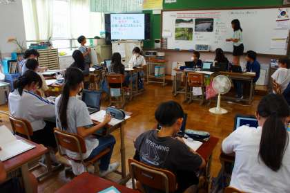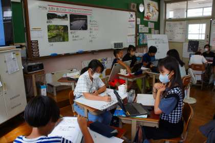 史実を元に、自分がどんな考えをもったのか、ふり返りを一生懸命書いていた姿が印象的でした。写真は2組の様子です。