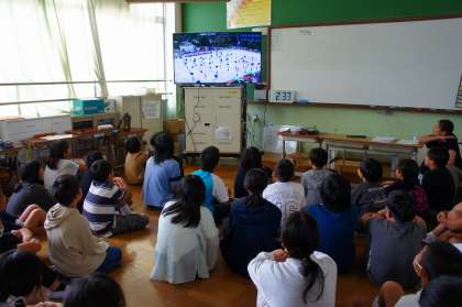 運動会を終えた5校時に、みんなでもう一度演技を見てみました。上からのアングルで客観的に見ると全体の様子が分かって、また違った印象に見えました。
