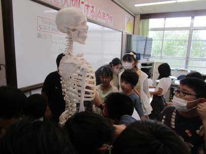 理科「わたしたちの体と運動」では、人間の骨のつくりについて調べました。タブレットや本だけでなく、人体模型も使って調べていきました。