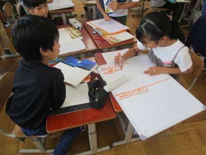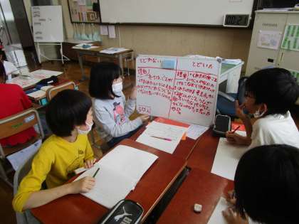 国語科「ごんぎつね」では、ごんのお詫びの気持ちが兵十に届いたかどうかをグループで話し合いました。その後、他のグループメンバーと交流し、それぞれのメンバーが聞いてきたことを自分のグループに戻って報告。考えを広げることができました。