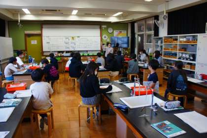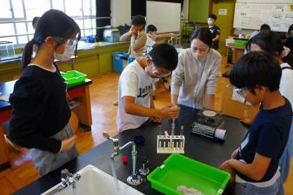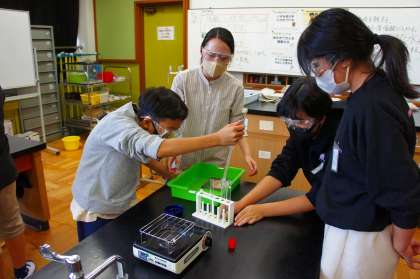 安全に気をつけながら、水溶液に関する実験を行い、実験を通して考察しています。少し難しいところもありますが、「難しいから、苦手なところを自主勉強で復習します!」という人もいます。