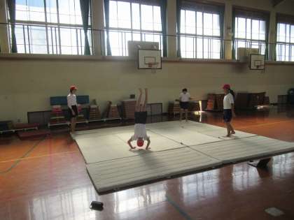 5年生のマット運動の学習では、グループで音楽に合わせて表現する「シンクロマット」に取り組みました。