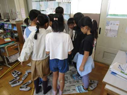 算数科「面積」では、新聞紙を貼り合わせて、1平方メートルの広さを作りました。その上に立ったり、踊り場や洗面所に並べたりして、面積の感覚をきたえていきました。