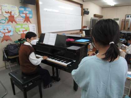 音楽科では「オーラリー」の楽曲のテストをしました。滑らかに吹きながら、高音部分も安定した音を出せる子もいました。