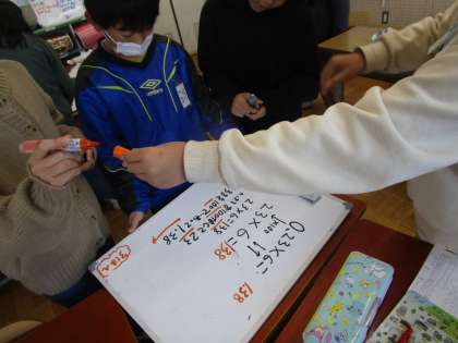 算数科「小数のかけ算やわり算」では、「0.23×6」の計算の仕方をグループで話し合いました。その後、それぞれのやり方をワールドカフェで交流。どちらの考え方も「23×6」と整数を基にして考えることが分かりました。