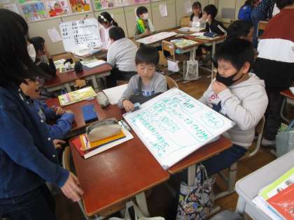 社会科「用水のけんせつ」では、琵琶湖疏水の工事がどのように行われたのか、資料をもとに調べていきました。その後、ワールドカフェで交流。自分のグループで調べた内容との違いについて質問する姿も見られました。