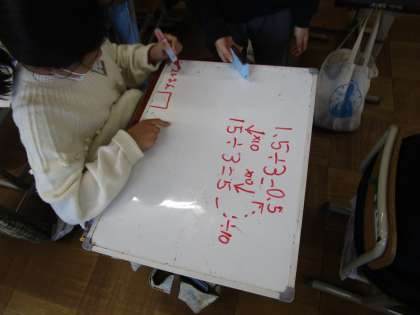 算数科「小数のかけ算やわり算」では、「1.5÷3」の計算の仕方をグループで話し合いました。小数のかけ算の時のやり方をいかして、分かりやすく説明することができました。