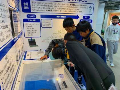 京都でモノづくりをしている企業やその企業に携わった人物についての展示ブースで、調べ学習をしました。さまざまな仕掛けがある展示に興味津々の子どもたちです。