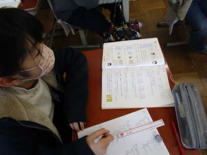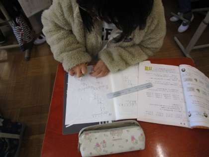 算数科「小数のかけ算やわり算」では、小数のわり算の練習問題にチャレンジしました。問題数は多かったのですが、最後まで粘り強く解いていました。