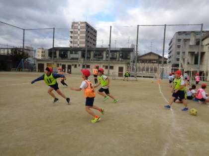 ルールは学校独自のもので,フォワードの3人でパスつないで