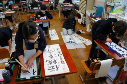 文字のバランスやとめ・はね・はらいをはじめとした点画のきまりなどに気を付けて書きました。大きな紙を前にして、どの子も真剣な表情で取り組んでいました。