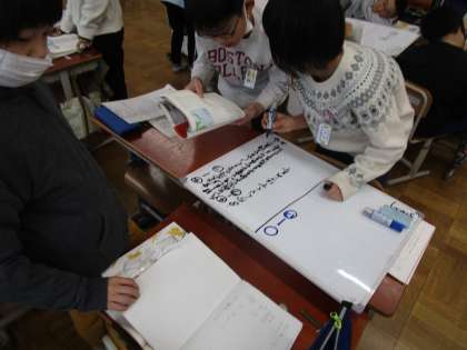 国語科「ウナギのなぞを追って」では、中の部分がどこで2つに分かれるかについて考えました。グループで話し合った考えを他のグループのメンバーと交流していきました。