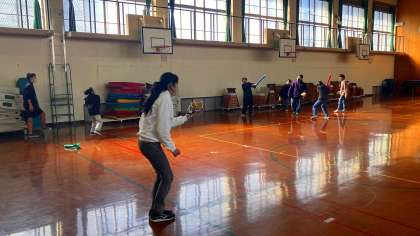 体育館では、「フォームロケット」という、正しいフォームで投てきの練習をするための道具にも親しみました。どこまで届くか競争したり、友だちと向かい合って投げっこをしたり、子どもたち同士で工夫しながら楽しむ様子が見られました。
