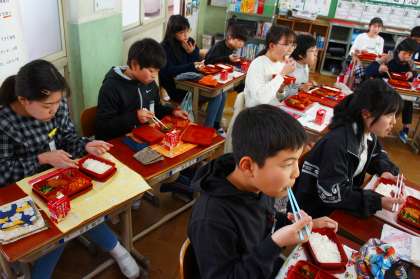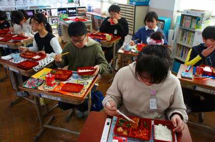 初めて食べる中学校給食に、「量は多くないかな。食べきれるかな?」「どんな感じなんやろう・・・」と、食べる前にはドキドキしている子もいましたが、食べ始めるなり「おいしい!」「もっと多くてもいいな。」と、美味しく完食していました。