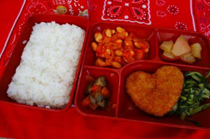 今日は、中学校の選択制給食の体験の日でした。バレンタインの行事献立の日だったので、メインのおかずはハート型のカレーコロッケ、デザートには焼りんごがついていました。