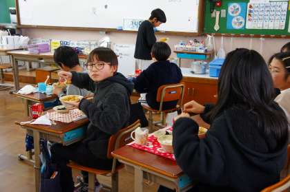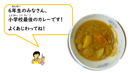 今日の給食は、大人気のカレー。先日の書写の学習でも、多くの子が「カレーが好き!」と、その文字を書いていました。そんなカレーも、小学校で食べるのはこれが最後。しみじみと味わって頂きました。