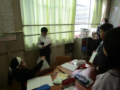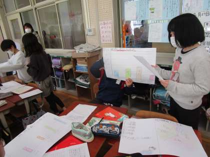 国語科「調べて話そう、生活調査隊」では、作った原稿を読み合い、修正していきました。その後、個人で発表練習に励み、グループで見合いながらアドバイスを送っていきました。