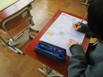 国語科「調べて話そう、生活調査隊」のテストに取り組みました。CDの音声をしっかりメモして問題に答えていきました。