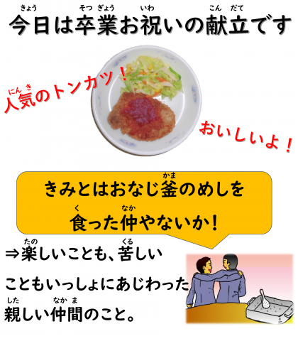 卒業生を祝う行事献立、毎年恒例で大人気のトンカツです。今年でいよいよ最後かぁ・・・と、ちょっぴり惜しみながらも美味しくいただきました。