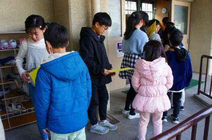 みんなが楽しみにしていた「6年生を送る会」。1年生に手を引かれて入場です。その前に、フレンドリーグループの1〜5年生が書いてくれたメッセージカードをもらいました。