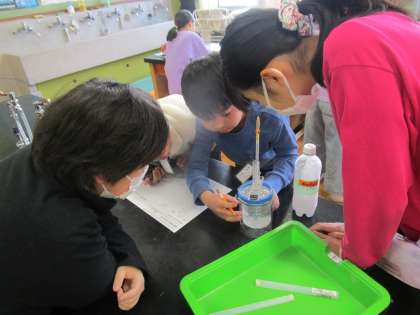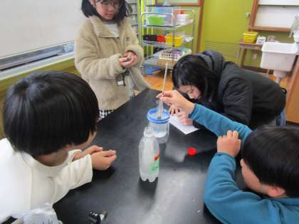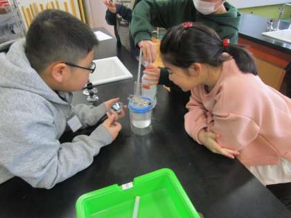 理科「すがたをかえる水」では、「水を冷やし続けると、水の温度と様子はどのようになるのか」について調べていきました。塩を混ぜた氷水につけて、変化を観察していきました。