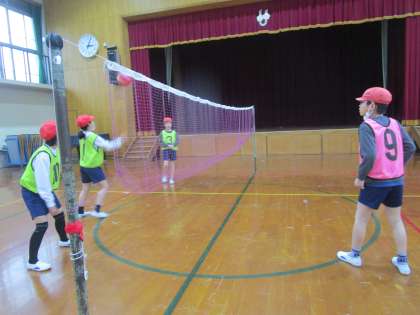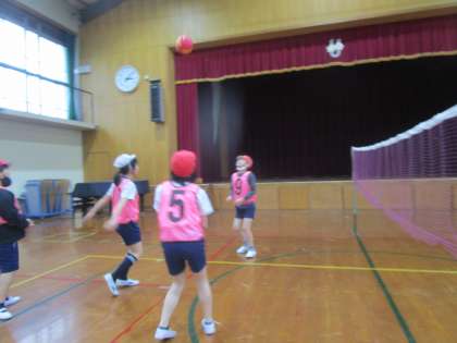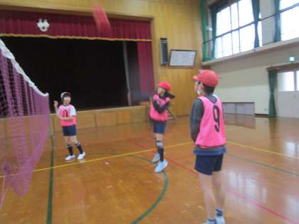 体育科「ソフトバレーボール」では、3段攻撃を目指してチームでつないでいます。帰って来たボールの1回目は、しっかり上に上げるという意識が少しずつ浸透してきました。