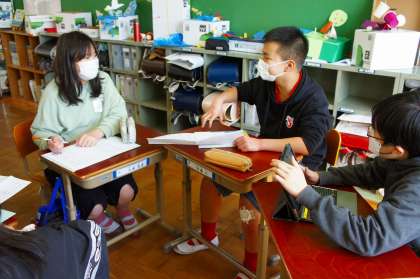 座談会の様子です。自分が考えたことを熱心に伝えるとともに、友だちの話も真剣に聞くことができました。